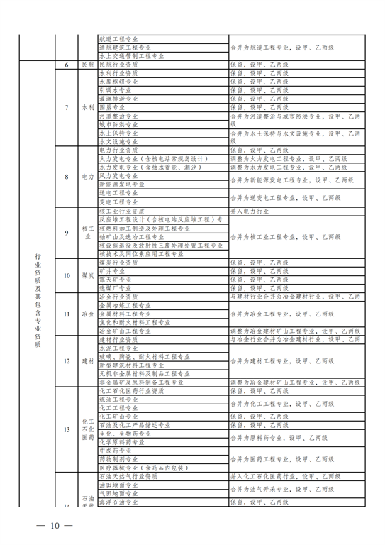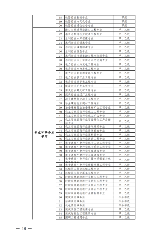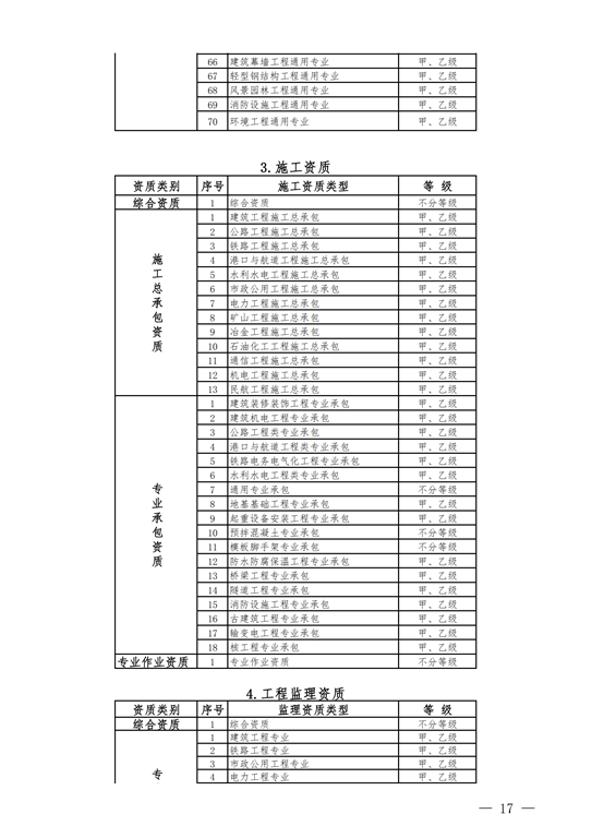 2.工程設(shè)計(jì)資質(zhì)。保留綜合資質(zhì);將21類行業(yè)資質(zhì)整合為14類行業(yè)資質(zhì);將151類專業(yè)資質(zhì)、8類專項(xiàng)資質(zhì)、3類事務(wù)所資質(zhì)整合為70類專業(yè)和事務(wù)所資質(zhì)。綜合資質(zhì)、事務(wù)所資質(zhì)不分等級;行業(yè)資質(zhì)、專業(yè)資質(zhì)等級原則上壓減為甲、乙兩級(部分資質(zhì)只設(shè)甲級)。