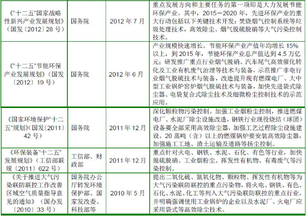 根據(jù)《國務(wù)院關(guān)于印發(fā)大氣污染防治行動計劃的通知》(國發(fā)〔2013〕37號)的要求,到2017 年,全國地級及以上城市可吸入顆粒物濃度比2012 年下降10%以上;京津冀、長三角、珠三角等區(qū)域細顆粒物濃度分別下降25%、20%、15%左右;加快重點行業(yè)脫硫、脫硝、除塵改造工程建設(shè)。所有燃煤電廠、鋼鐵企業(yè)的燒結(jié)機和球團生產(chǎn)設(shè)備、石油煉制企業(yè)的催化裂化裝置、有色金屬冶煉企業(yè)都要安裝脫硫設(shè)施,每小時20 蒸噸及以上的燃煤鍋爐要實施脫硫。除循環(huán)流化床鍋爐以外的燃煤機組均應(yīng)安裝脫硝設(shè)施,新型干法水泥窯要實施低氮燃燒技術(shù)改造并安裝脫硝設(shè)施。燃煤鍋爐和工業(yè)窯爐現(xiàn)有除塵設(shè)施要實施升級改造;京津冀、長三角、珠三角等區(qū)域要于2015 年底前基本完成燃煤電廠、燃煤鍋爐和工業(yè)窯爐的污染治理設(shè)施建設(shè)與改造,完成石化企業(yè)有機廢氣綜合治理。